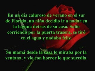 El documento cuenta la historia de un niño que casi fue atacado por un cocodrilo mientras nadaba en una laguna detrás de su casa. Su mamá logró rescatarlo agarrándolo con fuerza de los brazos, a pesar de que el cocodrilo ya le había agarrado las piernas. Aunque el niño sobrevivió, quedó con cicatrices en las piernas, pero se enorgullecía más de las marcas de las uñas de su mamá en sus brazos, que mostraban que ella no lo soltó y le salvó