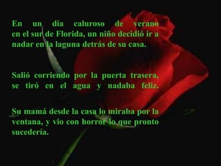 Un niño casi fue atacado por un caimán mientras nadaba, pero su madre lo salvó agarrándolo con fuerza a pesar de que el caimán también lo agarraba. Aunque el niño sufrió heridas en las piernas, sobrevivió gracias al amor y la determinación de su madre. Al igual que las cicatrices físicas del niño, todos llevamos cicatrices emocionales de experiencias dolorosas, pero Dios nos sostiene para protegernos del mal, como la madre salvó a su hijo del caimán