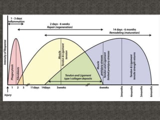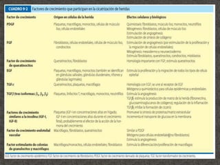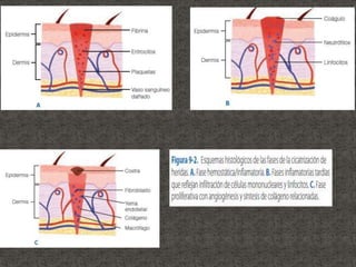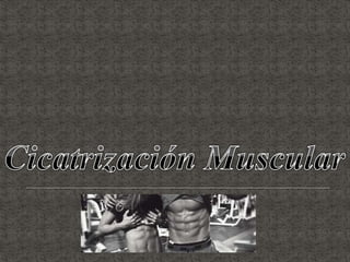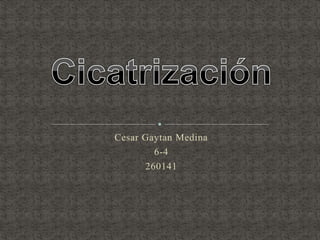 El documento resume la definición, antecedentes y procesos de la cicatrización. Cubre las fases de la cicatrización (hemostasia e inflamación, proliferación, síntesis de matriz, maduración y remodelación, epitelización), factores que influyen en ella, y tipos de cicatrización en diferentes tejidos como piel, tubo digestivo, cartílago, tendón, hueso y nervio.