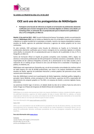 CICE jugará un papel clave en MadinSpain 2012 en Madrid, participando como escuela de referencia para la formación de profesionales en contenidos digitales. El evento reunirá a destacados diseñadores y agencias de publicidad de todo el mundo, con conferencias programadas durante dos días. Además, CICE se encargará de la cobertura fotográfica y la dinamización en redes sociales del festival.