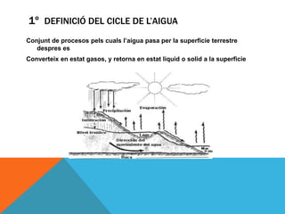 El ciclo del agua consiste en procesos por los cuales el agua pasa por diferentes estados entre la superficie terrestre y la atmósfera. El ciclo comienza con la evaporación del agua de los océanos y la tierra debido al calor del sol. El vapor de agua se condensa para formar nubes y luego se precipita en forma de lluvia, nieve o granizo. Parte del agua se infiltra en el suelo mientras que otra parte corre por la superficie.