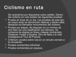 El documento describe los diferentes tipos de ciclismo, incluyendo ciclismo en ruta que se disputa en asfalto y tiene pruebas como carreras de un día o por etapas como el Tour de Francia, ciclismo en pista que se realiza en velódromos con pruebas de velocidad o persecución, y ciclismo de cross country en circuitos naturales a través de bosques.