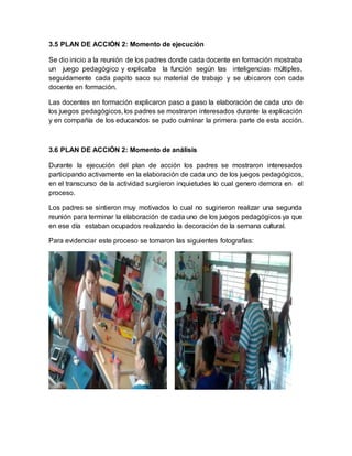 Este documento describe un plan de acción para abordar problemas en la educación de los niños. En la primera parte, los padres de familia se reunieron y crearon materiales pedagógicos como mapas, cubos y figuras geométricas. Luego, en la ejecución, las docentes mostraron juegos pedagógicos a los padres y los guiaron en la creación de sus propios juegos. Finalmente, los padres participaron activamente y disfrutaron del proceso a pesar de algunas demoras, por lo que acordaron una segunda re