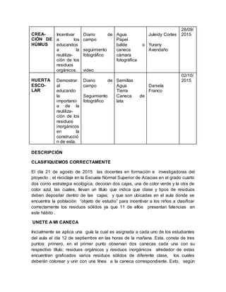 Este documento resume varias actividades realizadas como parte de un proyecto de investigación sobre el reciclaje en una escuela primaria en Colombia. Las actividades incluyen incentivar a los estudiantes a clasificar correctamente los desechos, evaluar su comprensión sobre clasificación a través de guías y juegos, promover la creatividad y reutilización de materiales reciclables, e incentivar la reutilización de desechos orgánicos para crear humus y construir una huerta escolar. Las actividades fueron documentadas a través de diarios de