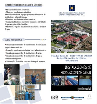 El documento describe las competencias profesionales y salidas laborales del grado medio de Instalaciones de producción de calor. Las competencias incluyen montar e instalar sistemas de calefacción, agua caliente, e instalaciones solares térmicas e de gas. Las salidas profesionales son como instalador y mantenedor de dichos sistemas de calefacción, agua caliente, e instalaciones de gas y combustibles.