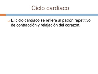 El documento describe el ciclo cardiaco, el patrón repetitivo de contracción y relajación del corazón. Explica que las aurículas se contraen de forma casi simultánea, seguido por la contracción de los ventrículos, lo que permite que la sangre fluya de las aurículas a los ventrículos. Luego, las presiones de los ventrículos abren las válvulas semilunares para que la sangre salga de los ventrículos.