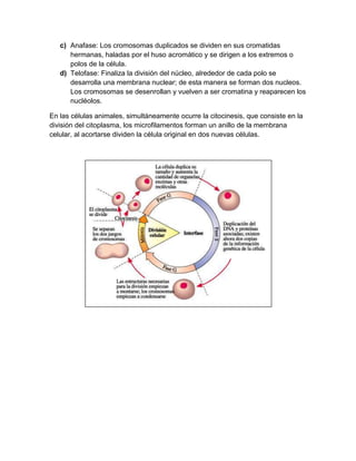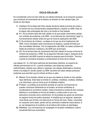 El ciclo celular consta de dos fases principales: la interfase, donde la célula crece y duplica su ADN, y la mitosis, donde ocurre la división celular en dos células hijas idénticas. La interfase incluye las etapas G1, S y G2, mientras que la mitosis comprende las etapas de profase, metafase, anafase y telofase, culminando en la citocinesis que divide el citoplasma y forma dos nuevas células.
