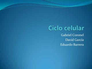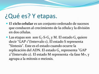 El documento describe las etapas del ciclo celular, incluyendo la interfase (que consta de las fases G1, S y G2) y la fase M de mitosis y citocinesis. Explica que el ciclo celular está regulado por un sistema que monitorea cada paso y detiene el ciclo si no se cumplen las condiciones para avanzar a la siguiente etapa.
