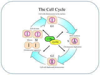 Este documento presenta información sobre el ciclo celular y la mitosis. Resume las etapas del ciclo celular (interfase y división celular) y describe las subetapas de la interfase (G1, S, G2). También explica las etapas de la mitosis: profase, metafase, anafase y telofase.