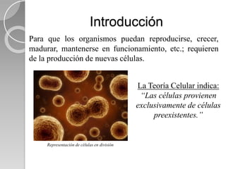 El documento describe el ciclo celular, incluyendo las etapas de la interfase y la mitosis, así como las proteínas clave como las ciclinas y cinasas dependientes de ciclina que controlan la progresión a través de las etapas. También explica los mecanismos de control del ciclo celular, como la replicación del ADN, la condensación de los cromosomas y la segregación de las cromátidas hermanas durante la división celular.