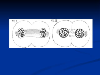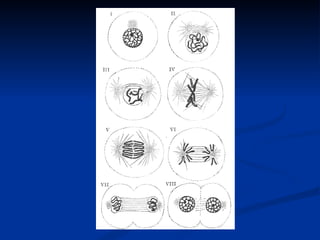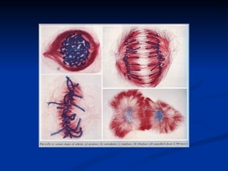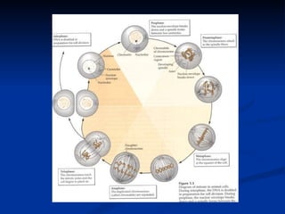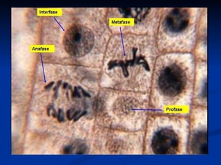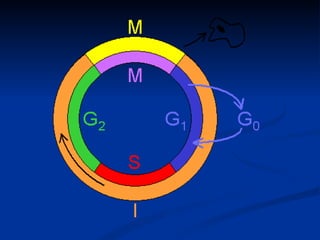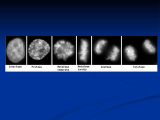 El ciclo celular consta de la interfase y la fase M. La interfase incluye las fases G1, S y G2, durante las cuales la célula crece y duplica su ADN. La fase M es la división celular, que incluye la mitosis y la citocinesis para formar dos células hijas idénticas. La mitosis a su vez comprende las etapas de profase, metafase, anafase y telofase, donde se dividen y separan los cromosomas.