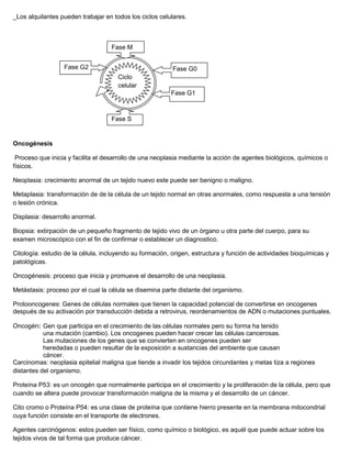El documento describe el ciclo celular, incluyendo sus diferentes fases como la interfase y la mitosis. También explica factores que afectan el ciclo celular como fármacos, virus y oncogenes, así como el proceso de carcinogénesis y diferentes tipos de cáncer y sus agentes carcinógenos asociados.