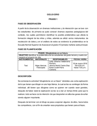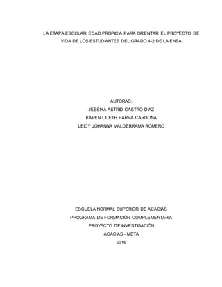 El documento describe las diferentes fases de un proyecto de investigación realizado por estudiantes de la Escuela Normal Superior de Acacias para identificar la problemática de los estudiantes de 4o grado con respecto a su proyecto de vida. En la fase de planificación se diseñó la actividad "Dibujándome en un futuro" para que los estudiantes dibujaran cómo se ven en el futuro y respondieran un test. La fase de ejecución mostró que muchos estudiantes tenían dudas sobre su futuro y les daba vergüenza hablar en público. Final