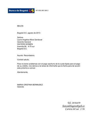 El documento contiene varias cartas de una gerente de banco a una clienta recordándole el pago pendiente de una cuota de crédito. En la primera carta se le recuerda amistosamente la fecha próxima de pago. En la segunda se le solicita de forma amistosa que pague la cuota. En la tercera se le notifica que aún no han recibido pago y piden efectuarlo de forma oportuna.