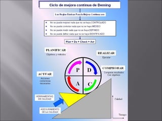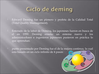 Edward Deming fue un pionero de la Calidad Total que enseñó un nuevo sistema a los japoneses en 1950, lo que llevó a mejoras en sus empresas. Un punto clave presentado por Deming fue el ciclo de mejora continua de 4 pasos: planificar cambios, probarlos a pequeña escala, verificar los resultados y aplicarlos a gran escala si funcionan. Este ciclo PHVA puede usarse para mejorar procesos individuales o un sistema completo mediante herramientas estadísticas como diagramas de causa-efecto.