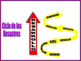 El documento define los términos amenaza, vulnerabilidad y riesgo, y describe las fases del ciclo de gestión de desastres, incluyendo la prevención, mitigación, preparación, alerta, respuesta, rehabilitación y reconstrucción. Explica que el desarrollo puede aumentar o reducir la vulnerabilidad y que los desastres pueden retrasar o proporcionar oportunidades para el desarrollo.