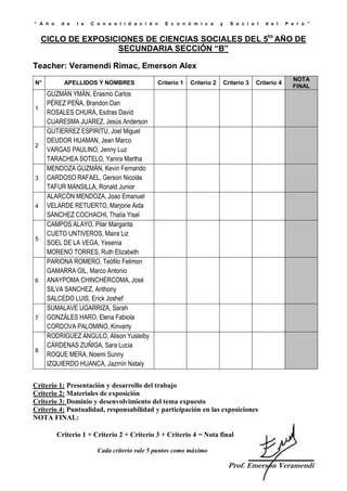 El documento presenta la lista de estudiantes del 5to año de secundaria de la sección "B" que realizarán exposiciones sobre ciencias sociales. Cada estudiante será evaluado en cuatro criterios relacionados a la presentación, materiales, dominio del tema y participación. La nota final se calculará como la suma de las notas de los cuatro criterios divididos entre cuatro. El profesor Emerson Veramendi será el encargado de calificar a los estudiantes.