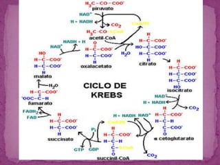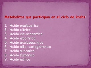 El ciclo de Krebs es una serie de reacciones que ocurren en las mitocondrias para catalizar el catabolismo de los residuos de acetilo liberados durante la oxidación de los alimentos, liberando hidrógeno que permite la liberación de energía. Participan metabolitos como el ácido oxalacético, ácido cítrico, ácido isocítrico y ácido succínico. El proceso recibe aportes vitamínicos de la riboflavina, niacina, tiamina y ácido pantoténico.