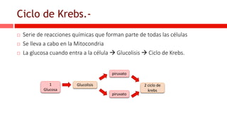 El ciclo de Krebs es una serie de reacciones químicas que ocurren en la mitocondria de las células y que forman parte del proceso metabólico por el cual la glucosa se oxida para producir energía. El ciclo de Krebs produce NADH, FADH y GTP que alimentan la fosforilación oxidativa para generar ATP.