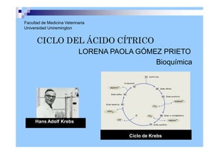 El ciclo de Krebs (también llamado ciclo del ácido cítrico) es una serie de reacciones químicas que forman parte de la respiración celular en células aerobias y que oxida moléculas como hidratos de carbono, ácidos grasos y aminoácidos hasta producir CO2, agua y ATP. El ciclo consta de 8 reacciones que convierten el acetil-CoA en oxaloacetato, produciendo moléculas de NADH, FADH2 y GTP que generan ATP a través de la