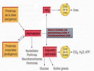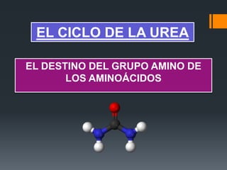 El documento describe el ciclo de la urea, un proceso metabólico que convierte el amoníaco tóxico de los aminoácidos en urea en el hígado. El ciclo consta de reacciones en la mitocondria y el citosol que involucran intermedios como la glutamina, aspartato y arginina para finalmente producir urea. Los trastornos en este ciclo pueden tener graves consecuencias para la salud. El documento también explica otros procesos como la síntesis de aminoácidos específicos, incluid