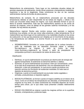 El documento describe el ciclo de las rocas. Existen tres tipos principales de rocas: ígneas, formadas por la solidificación de magma; metamórficas, formadas a partir de otras rocas transformadas por presión y temperatura; y sedimentarias, formadas por la acumulación de sedimentos. Las rocas ígneas pueden ser plutónicas, que cristalizan lentamente en el interior de la Tierra, o volcánicas, que cristalizan rápidamente en la superficie.