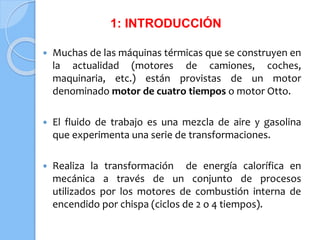 El documento describe el ciclo de Otto, que es fundamental en motores de combustión interna, y detalla sus cuatro etapas: admisión, compresión, trabajo y escape. Se incluye un diagrama de presión-volumen que ilustra los procesos involucrados y la importancia de la relación de compresión en la eficiencia del ciclo. Finalmente, se destaca que un mayor rendimiento se logra con una mayor relación de compresión.