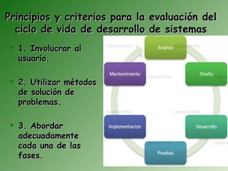 El documento describe diferentes modelos del ciclo de vida del desarrollo de sistemas de información, incluyendo el modelo clásico o en cascada, el modelo incremental, y el modelo de desarrollo evolutivo. Explica las diferentes fases de cada modelo como el análisis de requisitos, diseño, codificación, pruebas y mantenimiento.