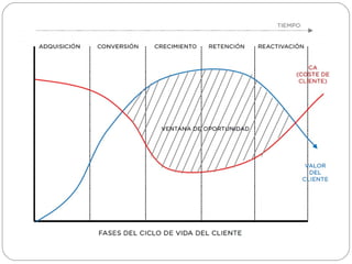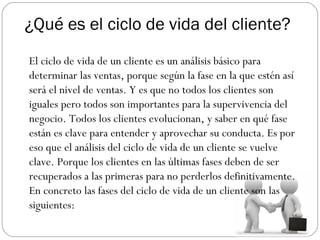 Este documento describe el ciclo de vida del cliente y presenta un plan de retención. Explica que el ciclo de vida incluye fases como adquisición, conversión, crecimiento, retención y reactivación. Luego, analiza el ciclo de vida de los clientes de una consultoría empresarial, estimando que será de 12 años máximo debido a los límites de edad de los programas de financiamiento. Finalmente, el plan de retención propone controlar a los clientes a través de CRM, fomentar su participación, capacitar