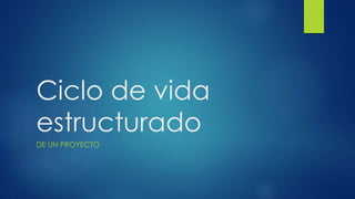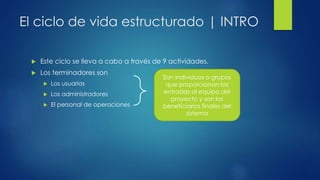 El documento describe las 9 actividades del ciclo de vida estructurado de un proyecto. Estas actividades incluyen la encuesta inicial, el análisis de sistemas, el diseño, la implementación, las pruebas de aceptación, la garantía de calidad, la descripción de procedimientos, la conversión de bases de datos e instalación. El documento también discute los enfoques radical y conservador para el desarrollo del proyecto.