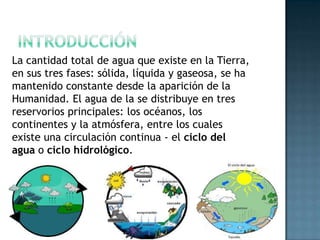 El ciclo hidrológico describe la circulación continua del agua entre los océanos, la atmósfera y los continentes a través de la evaporación, condensación y precipitación. Comienza con la evaporación del agua de los océanos a la atmósfera, donde se enfría y condensa para formar gotas de lluvia, nieve o granizo que luego precipitan a la tierra o los océanos, completando así el ciclo.