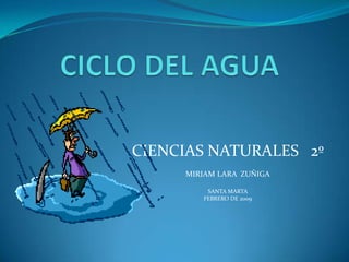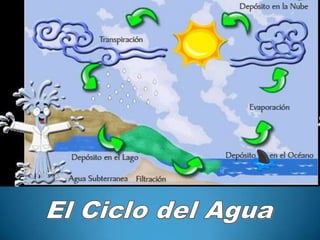 El documento describe el ciclo del agua, explicando cómo el sol evapora el agua de los océanos y mares para formar nubes, las cuales son transportadas por el viento hacia el interior donde se enfrían y condensan para caer como lluvia, nieve o granizo. Parte del agua cae a los ríos y la tierra, y otra parte se une a las aguas subterráneas, desembocando todo de nuevo en los océanos para reiniciar el ciclo.
