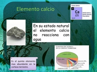 El documento describe el ciclo del calcio. El calcio se encuentra de forma natural en la corteza terrestre y se mueve entre organismos vivos y el medio ambiente a través de un ciclo sedimentario. En la naturaleza, el calcio se encuentra en compuestos como la caliza, dolomita, yeso y fluorita. El calcio cumple funciones importantes en plantas, animales y seres humanos como formar huesos y tejidos y apoyar procesos vitales. Los descomponedores devuelven el calcio al suelo para que