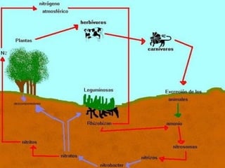 El ciclo del nitrógeno describe cómo el nitrógeno se incorpora al suelo a través de las plantas y animales, se mueve a través de la cadena alimentaria, y regresa a la atmósfera a través de la descomposición y procesos de nitrificación realizados por microorganismos.