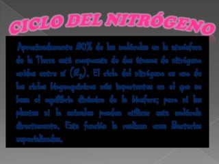 El ciclo del nitrógeno describe cómo el nitrógeno se mueve entre la atmósfera, la biosfera y la litosfera. Las bacterias fijan el nitrógeno atmosférico en formas que las plantas pueden usar y los animales obtienen nitrógeno de las plantas y otros animales. Cuando los organismos mueren, el nitrógeno se descompone y regresa al suelo, agua u otros organismos a través de procesos como la mineralización, nitrificación y desnitrificación.