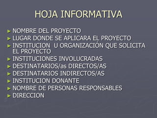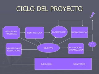 El documento presenta el ciclo de un proyecto, desde la identificación de una necesidad o problema, pasando por la elaboración, prefactibilidad, evaluación de resultados, activación y organización, ejecución y monitoreo. Asimismo, incluye formatos para la hoja informativa, formulación, estructura, dinámica y marco lógico de un proyecto, con el objetivo de proporcionar las herramientas necesarias para el diseño y gestión de proyectos de manera ordenada y sistemática.