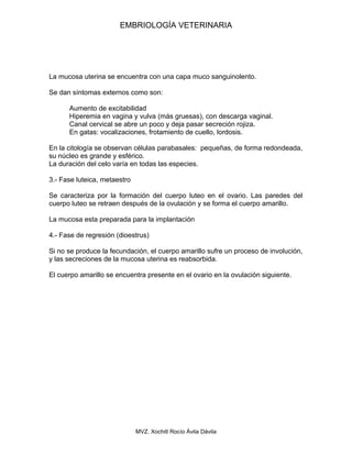 El documento describe el ciclo estral de los animales, el cual consta de cuatro fases reguladas por hormonas: 1) Fase de maduración donde se desarrollan los folículos ováricos, 2) Celo o estro donde ocurre la ovulación, 3) Fase luteínica donde se forma el cuerpo amarillo, y 4) Fase de regresión donde el cuerpo amarillo se involuciona si no ocurre la fecundación. El ciclo permite la ovulación y prepara el útero para posible implantación y es necesario para la reprodu