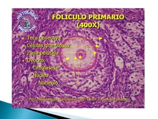 Este documento presenta información sobre las hormonas FSH, LH, andrógenos y estrógenos involucradas en el ciclo menstrual femenino. Explica que la FSH estimula el crecimiento del folículo ovárico, la LH favorece la ovulación y luego la formación del cuerpo lúteo, y los andrógenos y estrógenos desempeñan un papel en la maduración del endometrio y la preparación del útero para un posible embarazo.