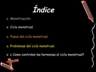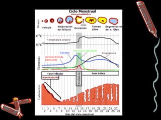 El documento describe el ciclo menstrual femenino. Explica que consta de dos fases principales (folicular y lútea) separadas por la ovulación. También describe los problemas más comunes como la dismenorrea (dolor menstrual), la amenorrea (ausencia de la menstruación), y el sangrado uterino anormal. Finalmente, señala que cuatro hormonas controlan el ciclo, incluyendo la hormona folículo estimulante y la progesterona producidas en los ovarios, y estrógenos secretados en mayor cantidad durante las primeras etapas