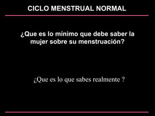 El ciclo menstrual normal dura entre 28-35 días y consta de 4 fases: fase posmenstrual, fase proliferativa, fase secretora y fase menstrual. Las hormonas producidas por los ovarios y la hipófisis regulan estas fases y el crecimiento del endometrio. La ovulación ocurre a mitad del ciclo cuando las gonadotropinas estimulan el desarrollo folicular y la liberación del óvulo.