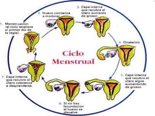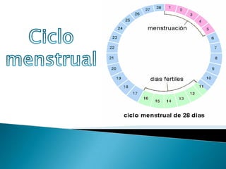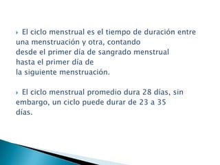 El ciclo menstrual dura entre 23 y 35 días y consta de 4 fases: la menstruación, la fase folicular, la fase ovulatoria y la fase lútea. La menstruación marca el inicio del ciclo y dura aproximadamente 5 días, durante los cuales el útero se desprende del revestimiento interno. La ovulación ocurre a mitad del ciclo cuando un óvulo es liberado desde el ovario. La fase lútea prepara el útero para un posible embarazo mediante la producción de progesterona.