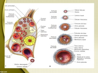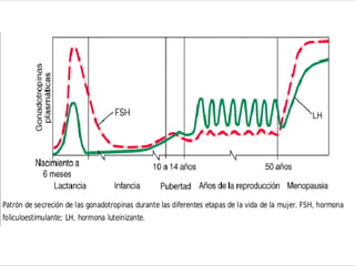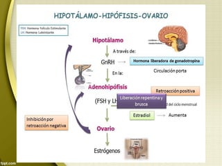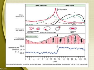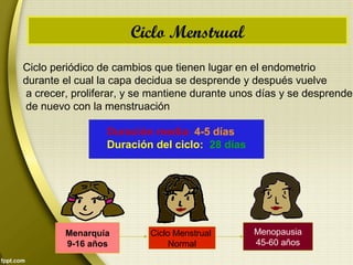 El documento describe el ciclo menstrual normal, incluyendo sus fases, duración y cambios hormonales y cíclicos en los órganos reproductivos como el endometrio, vagina y orificio cervical. El ciclo menstrual típico dura 28 días y consta de la fase folicular, fase ovulatoria y fase lútea. Los niveles de estrógenos y progesterona varían a lo largo del ciclo, causando cambios en los tejidos.