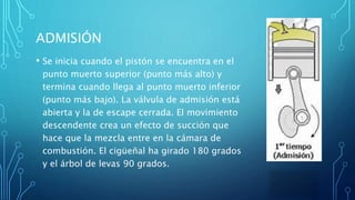 Este documento describe las fases del ciclo Otto teórico y real en un motor de automóvil, incluyendo la admisión, compresión, explosión y escape. También explica las diferencias entre el ciclo teórico y real, como las pérdidas de calor y el tiempo finito de apertura de válvulas. Por último, detalla algunas técnicas como el adelanto de la apertura de válvulas y el encendido que permiten que el ciclo real se aproxime más al teórico.
