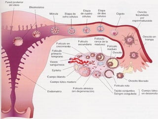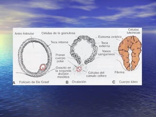 El ciclo ovárico implica la interacción de las hormonas del hipotálamo, la hipófisis y los ovarios. La FSH y la LH estimulan a los ovarios a producir estrógeno y progesterona, que a su vez estimulan el crecimiento y la preparación del útero. El folículo crece en etapas desde el primordial al de Graaf bajo la influencia de las hormonas. La ovulación es provocada por un pico de LH, luego el cuerpo lúteo produce progesterona para preparar el útero si oc