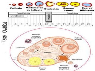 Este documento resume las diferentes fases del ciclo menstrual femenino. La fase folicular comienza después de la menstruación y dura hasta el día 10, cuando los folículos ováricos secretan estrógenos bajo la influencia de la FSH. Entre los días 10-14, la producción de estrógenos alcanza su máximo y estimula la LH, causando la ovulación. Después de la ovulación hasta el día anterior a la menstruación sigue la fase lútea, cuando el cuerpo amarillo secreta progesterona para preparar el
