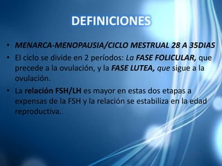 El documento describe el ciclo menstrual femenino, dividiéndolo en 4 fases: folicular, ovulatoria, lútea y menstrual. Explica los roles de las hormonas FSH, LH, estrógeno y progesterona en cada fase, incluyendo el desarrollo folicular, selección del folículo dominante, ovulación y formación del cuerpo lúteo. También cubre posibles alteraciones del ciclo como polimenorrea, oligomenorrea y amenorrea.