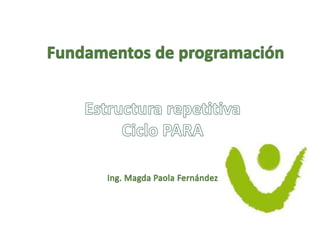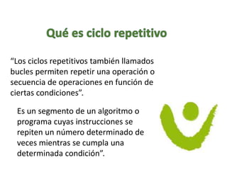 Los ciclos repetitivos, también llamados bucles, permiten repetir una secuencia de operaciones mientras se cumpla una condición. Dentro de los ciclos se utilizan contadores y acumuladores para regular el número de repeticiones. El ciclo PARA ejecuta un bloque de instrucciones n veces cuando se conoce el número de iteraciones, asignando un valor inicial al contador, repitiendo mientras se cumpla una condición, e incrementando el contador en cada repetición.