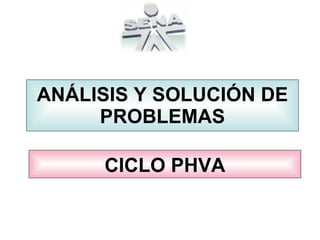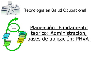 El documento explica el ciclo PHVA (Planificar, Hacer, Verificar, Actuar) para la mejora continua y su aplicación en la gestión de la salud ocupacional. Describe cada etapa del ciclo y cómo puede usarse para resolver problemas relacionados con riesgos de salud ocupacional mediante el establecimiento de objetivos, programas, responsabilidades y mediciones.