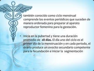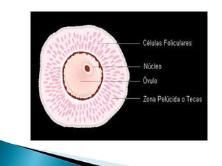 El ciclo ovárico femenino dura aproximadamente 28 días y prepara el útero para una posible implantación. Incluye la maduración y liberación de un óvulo desde el ovario, así como cambios en el endometrio bajo la influencia de hormonas. Si el óvulo no es fecundado, la menstruación comienza; si es fecundado, el cuerpo lúteo se forma para apoyar un embarazo.