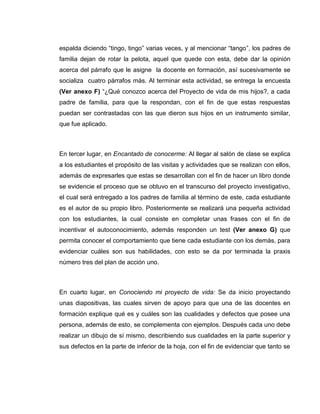 1) El documento describe 4 fases de un ciclo de un proyecto de investigación-acción que incluyó varias praxis con estudiantes y padres de familia para explorar el tema del proyecto de vida. 2) Se aplicaron instrumentos como entrevistas y encuestas para recolectar datos y se realizaron análisis cualitativos de los resultados. 3) Se identificaron fortalezas y áreas de mejora en la implementación de las praxis para orientar el desarrollo del proyecto.